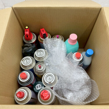 スプレー類は立てて段ボールに入れ、緩衝材を使って動かないように梱包してください。