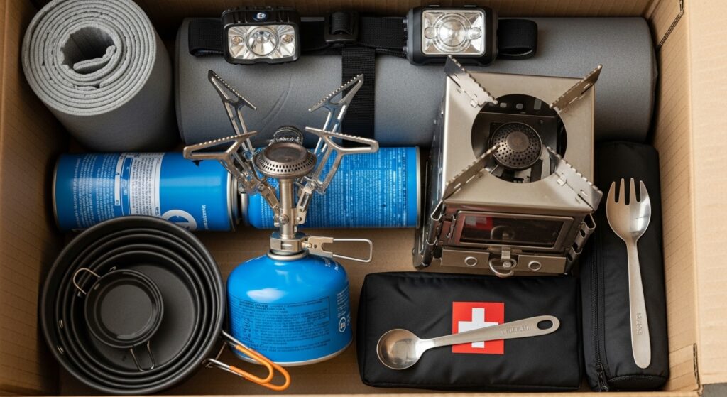 コンロやフライパン、ライト、カトラリーなど、すぐにでも使えそうな状態のものが揃っていました。