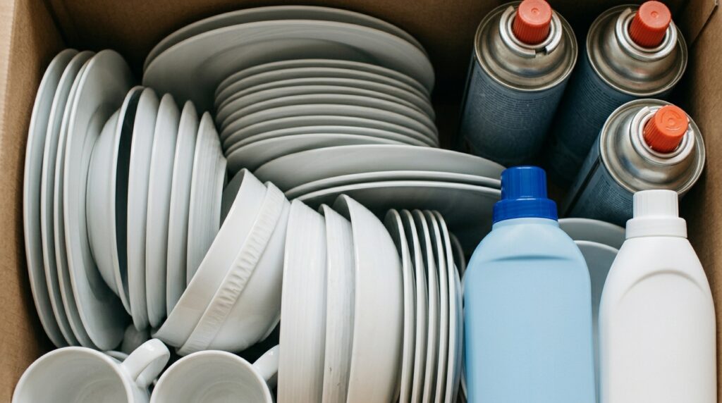当初はガス缶のみ、小さい箱での依頼を検討されていたそうですが、洗剤や不用品も一緒に送れるのだと知り、以前から考えていた食器の見直しもこの機会に実施。